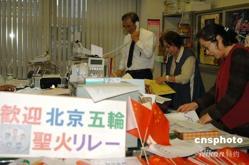 4月24日下午,长野县日中友好协会办公室内工作人员在为迎接圣火做最后的准备工作。长野县日中友好协会会员近万名,遍及全县各个地区,是日本影响力最大的日中友好协会之一。为了迎接北京奥运圣火的到来,他们做了大量细致的筹备工作。中新社发 朱沿华 摄