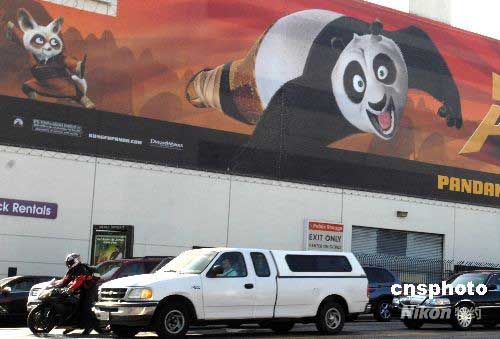 五月初,洛杉矶街头出现动画片《功夫熊猫》的大型宣传广告。由“梦工场”出品的好莱坞武打动画片《功夫熊猫》将于六月六日在北美首映。该片中国味十足,杰克·布莱克、达斯汀·霍夫曼、成龙等著名影星担纲英文版配音。制片商希望该片能成为《史莱克》系列之后的又一部缔造票房奇迹的动画片。中新社发 张炜 摄