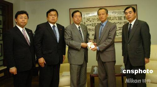 5月13日下午,日本执政党之一的公明党党首太田昭宏来到中国驻日使馆向四川地震灾区捐赠五十万日元善款。中国驻日大使崔天凯、公使孔铉佑代表中国政府接受了公明党的捐赠。中新社发 朱沿华 摄