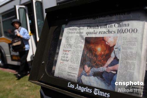 当地时间五月十三日,美国洛杉矶地区的主流媒体和主要中文媒体均在头版头条和内页突出报道四川汶川大地震。图为当天出版的美国主流媒体《洛杉矶时报》在头版突出报道汶川大地震。中新社发 张炜 摄