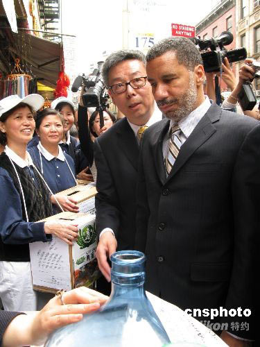 当地时间5月15日,纽约州长帕特森(右)和众议长萧华走访华埠,一同来到纽约中华公所门前的赈灾筹款摊位。帕特森呼吁全体纽约州民乃至美国人行动起来,为中国四川地震灾民捐款赈灾。中新社发 张碔 摄