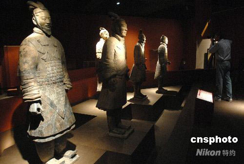 北美规模最大的秦始皇兵马俑展览五月十八日至十月十二日将在美国加州宝尔博物馆举行。十七尊中国“国宝”秦兵马俑和上百件中国秦代珍贵文物亮相本次展览,预计将吸引五十万美国观众。中新社发 张炜 摄