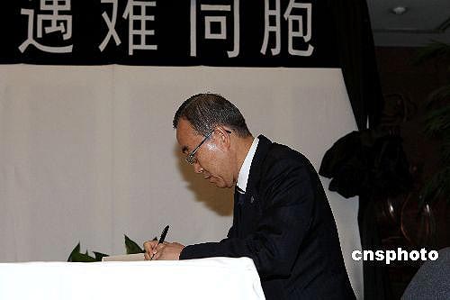 5月19日,联合国秘书长潘基文来到中国常驻联合国代表团,向四川大地震遇难者表示哀悼。潘基文在吊唁簿上用中文写道:哀悼罹难的中国人民。中新社发 谭宏伟 摄
