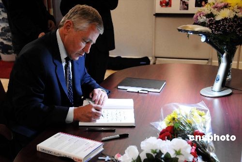 美国国会参院外交关系委员会成员、联邦参议员恰克·黑格尔,当地时间五月十九日傍晚来到中国驻美国大使馆悼念中国四川大地震遇难者。图为黑格尔参议员在悼念纪念册上留言:我为那些在四川大地震中遇难的中国人民感到悲痛,我坚信中国人民在政府的支持下能够克服目前的困难。