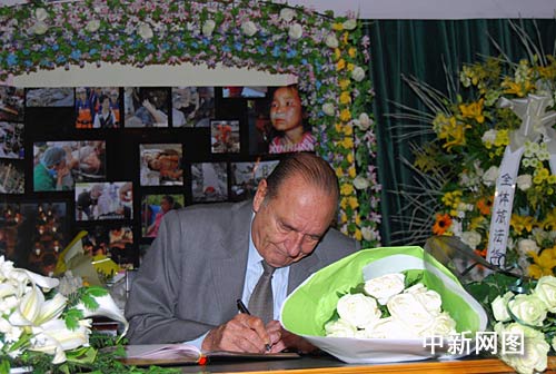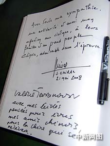 巴黎时间二十一日上午,法国前总统希拉克专程来到中国驻法国大使馆,向中国汶川地震的遇难者表示深切哀悼。希拉克在吊唁簿上写道:“对中国遇难者及他们的家属表示深切的哀悼和慰问,对伟大的中国人民在此次抗震救灾中的表现表示钦佩。” 作者:吴卫中