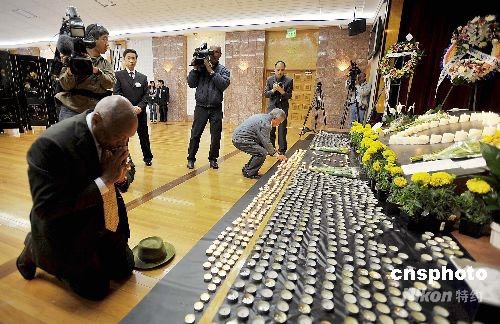 当地时间五月二十一日,中国驻旧金山总领馆大厅,旧金山前市长布朗在灵堂长跪,为中国汶川大地震遇难者默哀。布朗曾多次访问中国,并参观过四川卧龙大熊猫基地。他对大地震带给汶川人民的巨大痛苦深感悲伤。中新社发 陈钢 摄