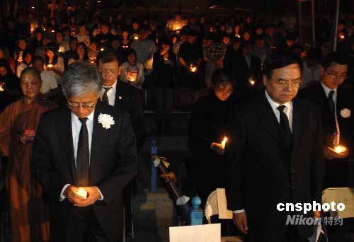 南加州悼念中国汶川地震遇难同胞烛光追思会当地时间五月二十一日晚在美国加州蒙特利公园市举行。各界人士手捧蜡烛在夜色中默默祈祷,悼念中国汶川地震遇难同胞,愿逝者早日安息,生者更加坚强。图为中国驻洛杉矶总领事张云(前左)、南加州华人联合总会会长程远(前右)和大家一起为遇难同胞默哀。中新社发 张炜 摄
