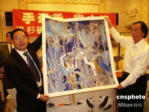 5月27日,著名旅美云南重彩画家丁绍光捐出自己6幅画作,参加洛杉矶66位画家及书法家“手牵手、画中情”共同为四川大地震捐画赈灾义卖活动。当天,丁绍光的5幅云南重彩画即被高价拍卖,这次义卖所有款项将交中领馆转四川灾区。图为丁绍光(右)展示义卖画作,左为南加州华人团体联合总会会长程远。中新社发 卢威 摄