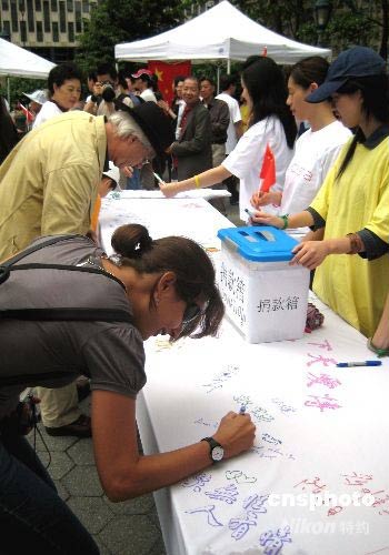 5月31日,由大纽约地区侨界、商界、学界共同发起的“手拉手,心连心,情系灾区,赈灾助学”大型义演活动在纽约曼哈顿举行。本次活动全部募捐所得款项都将转交中国驻纽约总领事馆,用于帮助四川灾区儿童尽快重返校园。图为观看义演活动的外国友人捐款后在“灾无情、人有情”的横幅上签名,祝福中国灾区人民早日重建家园。中新社发 邓悦 摄