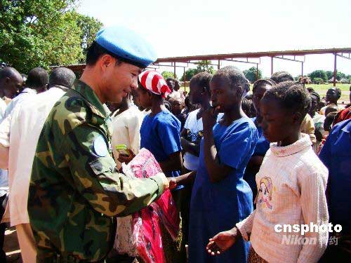 6月1日,正在联合国苏丹任务区执行维和行动的中国第三批赴苏丹维和工程兵大队官兵来到驻地女子小学,为孩子们带来书包、文具盒、笔记本等3000多件文具,献上中国军人对当地儿童和人民的爱心及情谊。中新社发 方叙潘 摄