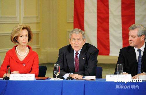 当地时间六月六日中午,美国红十字会、美国商会和一些企业共同发起一个圆桌会议,研讨如何进一步捐助中国地震灾区重建。美国总统布什在会上说,他对中国抗震救灾印象深刻,对中国政府和人民表示敬佩,并期待着在日本八加五国峰会上与胡锦涛主席见面。中新社发 邱江波 摄
