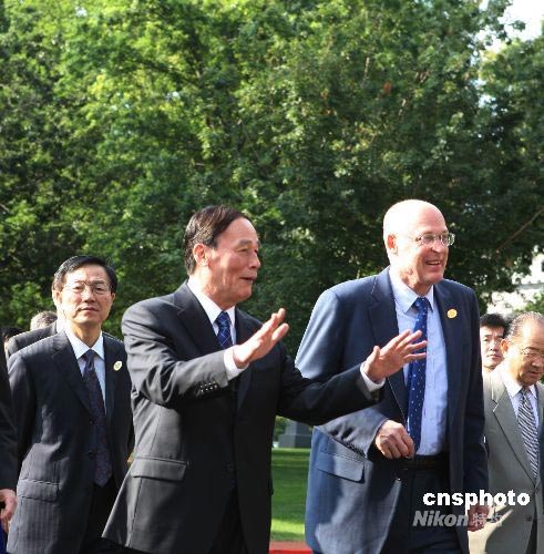 6月18日,第四次中美战略经济对话进入第二天。图为中国副总理王歧山与美国财长保尔森在对话开始前交谈。中新社发 谭宏伟 摄