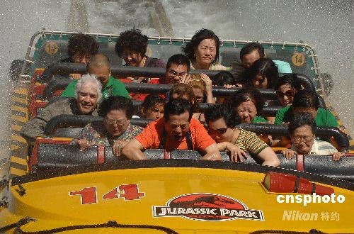 当地时间六月十八日,来自北京的旅游团成员在好莱坞“侏罗纪公园”享受惊险刺激。该旅游团于十七日晚抵达洛杉矶,他们是美国向中国旅游团正式开放后抵达洛杉矶的首批中国内地游客,共有七十多人,以中老年人为主。他们将在美国东西海岸主要旅游城市停留十二天至十三天,每位游客的团费约两万元人民币。中新社发 张炜 摄
