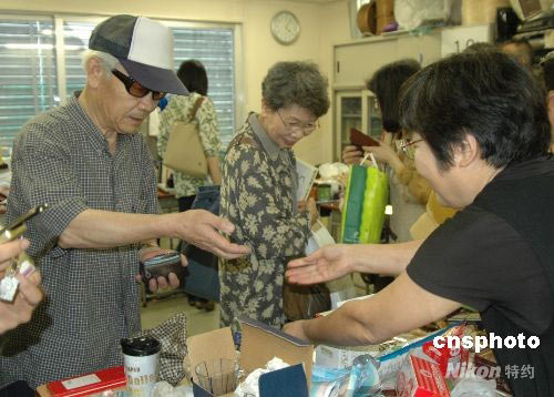 6月21日下午,在日中友好会馆学习汉语的日本友人为支援中国四川大地震灾区重建家园,发起并举办赈灾义卖活动。他们将家里闲置的书籍、厨具、衣物、玩具等以非常便宜的价钱卖出,所得全部收益都将捐给四川大地震灾区。图为一日本老伯选购两大袋物品后付钱给卖家。中新社发 关妍 摄