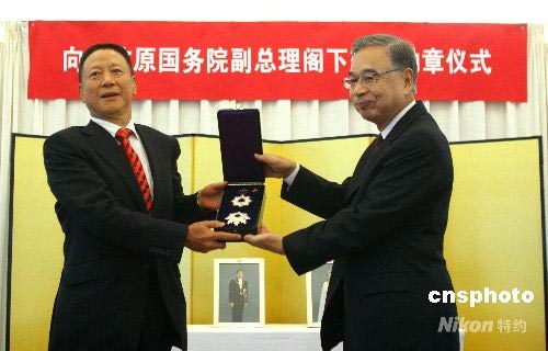 6月30日,日本授予中国前国务院副总理谷牧(本名刘家语)先生旭日大勋章。谷牧也是第二位被授予这一荣誉的中国人。图为日本国驻华大使宫本雄二(右)向谷牧先生长子赠送勋章。谷牧先生本人因身体原因未能出席本次授勋仪式。中新社发 富田 摄