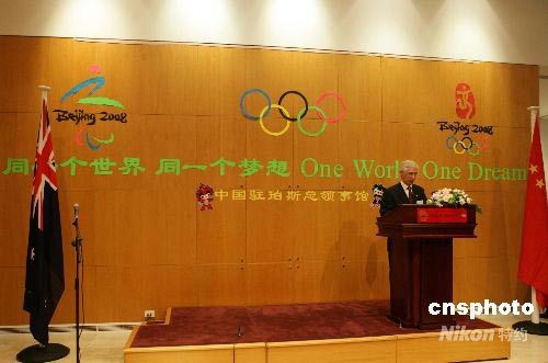 2008年7月8日,中国驻西澳珀斯总领馆举行北京奥运会倒计时一个月庆祝招待会。来自西澳洲政治、工商业、体育、文化等各界名流在总领馆举杯庆祝北京奥运的即将举行,领事馆为到会的嘉宾准备了北京奥运会会徽等纪念品令到场的嘉宾倍感兴奋。 中新社发 高周丹 摄