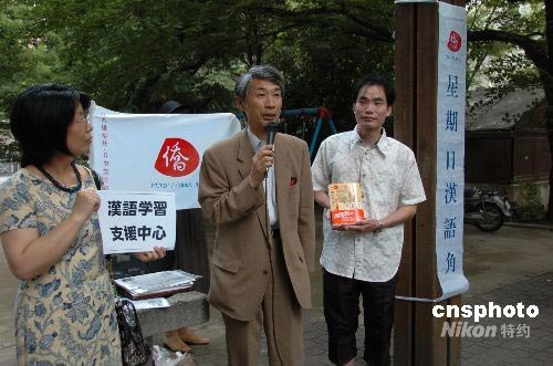 7月13日,在东京举行的星期日汉语角第48次交流会上,日本侨报社宣布汉语学习支援中心正式成立。汉语学习支援中心的首个支援项目是,面向研究者的中文读解力养成讲座9月开讲,由日本丽泽大学中文系三瀦正道教授担纲,每周一下午5点至7点免费为各大学的研究生和年轻学者、汉语学习者提供权威服务。图为三瀦正道教授(中)向汉语角参加者介绍汉语学习支援中心。中新社发 段跃中 摄