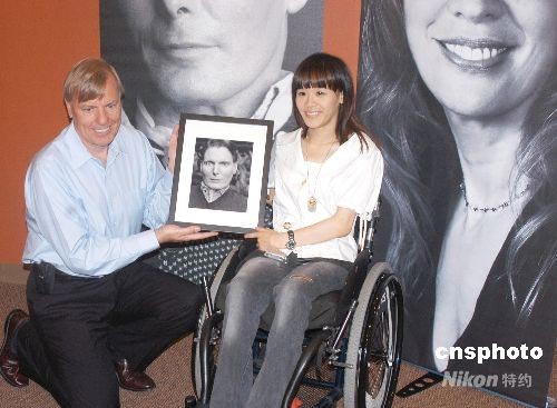 正在美国进行“感恩之旅”的桑兰7月15日前往位于新泽西的克里斯托弗-达纳里芙基金会拜会老朋友。该基金会是由“超人”的扮演者克里斯托弗和其妻子共同创立的。图为克里斯托弗-达纳里芙基金会会长彼得·威尔德洛特向桑兰赠送“超人”克里斯托弗纪念照。中新社发 管黎明 摄