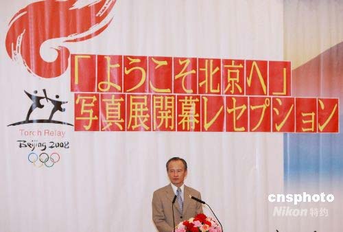 7月23日中午,由中国驻日使馆主办的《北京欢迎你》图片展在东京开幕。此次共展出94幅奥运题材摄影作品,从古都风貌、场馆建设、喜迎奥运等多个侧面全面展示了中国为举办一届成功奥运会所取得的杰出成就。图为中国驻日大使崔天凯在图片展开幕式上致词。中新社发 朱沿华 摄