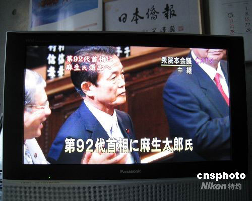 东京时间9月24日下午5时,日本自民党新总裁麻生太郎在临时国会首相指名选举中当选日本第92代日本首相。图为当选瞬间的麻生太郎。中新社发 段跃中 摄