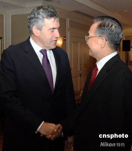 9月24日晚,中国总理温家宝在纽约会见英国首相布朗。中新社发 李静 摄
