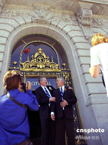 九月二十九日是美国旧金山同性恋伴侣麦卡弗和德斯勒相爱三十年的日子。三十年前的今天,他们在香港度蜜月。三十年后他们在旧金山市政府领取了结婚证书。加州最高法院裁定二00八年六月十六日是同性恋婚姻合法化的日子,但加州选民将在十一月再次对同性恋婚姻进行投票表决。中新社发 陈钢 摄