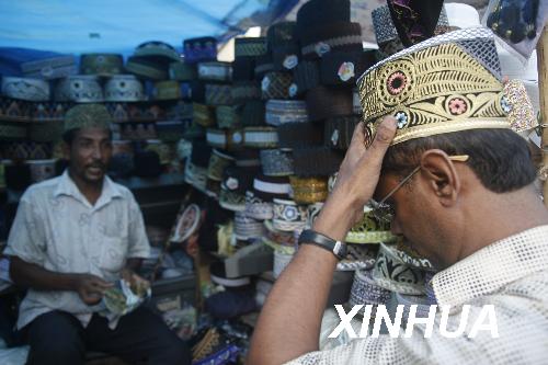 10月1日,在孟加拉国首都达卡,一名穆斯林男子购买祈祷礼帽,为开斋节做准备。新华社发(扎曼摄)