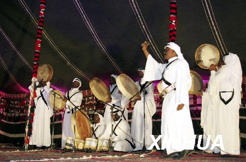 9月30日晚,在沙特阿拉伯首都利雅得,几名演员进行阿拉伯传统歌舞表演。沙特阿拉伯当天迎来开斋节,当地民众举行丰富多采的庆祝活动,欢度开斋节。新华社记者 李震 摄