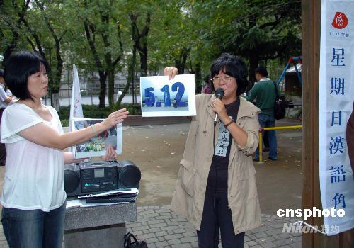 10月5日,日本自由撰稿人芦泽礼子女士在东京汉语角介绍她刚从中国四川震区采访的所见所闻。芦泽礼子介绍说,在四川震区活跃着大批中国和日本的志愿者。他们为灾区人民尽快重建家园、恢复生产生活,做出了可歌可泣的贡献。她说,通过这次大地震,志愿者精神在中国得到进一步普及,这对于中国今后的发展有着十分重要的意义。中新社发 段跃中 摄