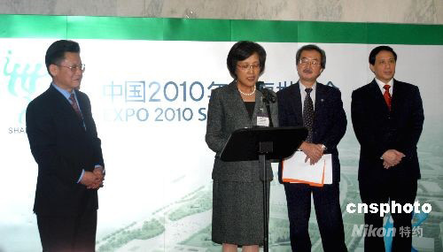 当地时间十月六日,“上海世博会联合国图片展”在纽约联合国总部开幕。上海世博会执委员常务副主任钟燕群(中)介绍上海世博会筹备情况。联合国副秘书长沙祖康(左)、副秘书长赤阪清隆(右二)和中国常驻联合国代表张业遂出席开幕式(右)。该图片展由上海世博会事务协调局、中国常驻联合国代表团和上海市对外文化交流协会共同举办。中新社发 汪晨 摄