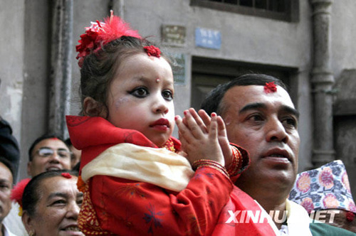 10月7日,3岁的马蒂纳入主尼泊尔首都加德满都的库玛里庙,成为新的活女神“库玛里”。在尼泊尔语里,“库玛里”意为“处女”,也被称为活女神,是从尼泊尔普通幼女中严格挑选出来的。被选为“库玛里”的幼女在三四岁时即被送去庙宇供信众朝拜,直至青春期。新华社发(高塔姆摄)