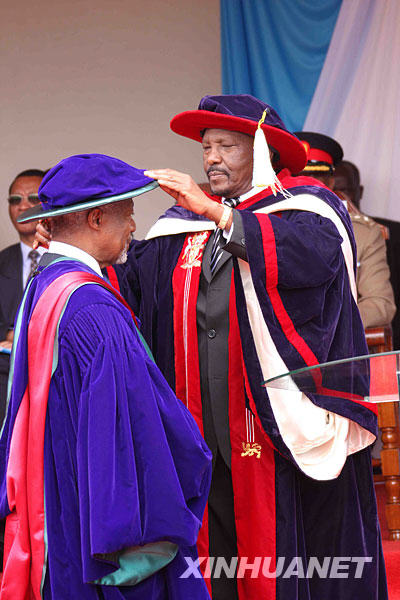 10月17日,在肯尼亚首都内罗毕,内罗毕大学副校长乔治·马果哈(左三)为联合国前秘书长科菲·安南(左二)穿上博士服。新华社发(汤姆·尼亚莫基摄)