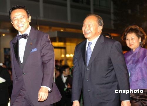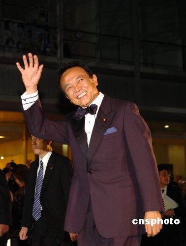 10月18日傍晚,第21届东京国际电影节开幕。以“环保”为主题的本届电影节别出心裁地将星光大道的地毯由红色改为绿色。上个月刚刚当选日本首相的麻生太郎与开幕影片《赤壁》剧组成员同走绿地毯,成为第一个光临东京国际电影节现场的日本总理大臣。中新社发 朱沿华 摄