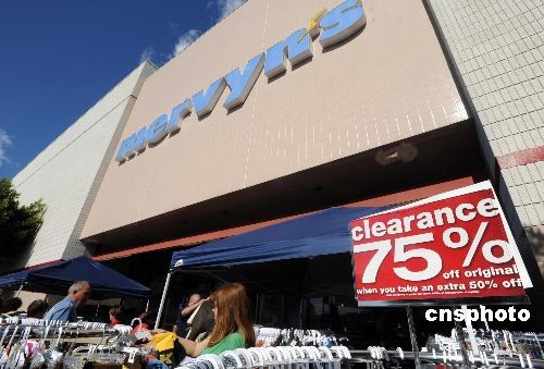 十月十八日,洛杉矶附近一家Mervyns百货店打出削价百分之七十五清货的告示,消费者正在选购清货甩卖的服装。拥有五十九年历史的美国老牌连锁百货公司Mervyns刚刚成为美国经济滑坡的新牺牲品。这家已经申请破产保护的百货公司周五宣布,旗下一百四十九家商店进行清货销售,然后关门停业。美国金融危机已经蔓延到实体经济,十月份美国消费信心指数创下三十年来最大月度跌幅。中新社发 张炜 摄
