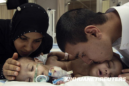 在沙特阿拉伯首都利雅得的一家医院,伊拉克连体男婴齐亚德和伊亚德的父母在亲吻熟睡中的孩子。这对四个月大的连体男婴将于25日迎来分离手术。新华社/路透