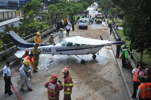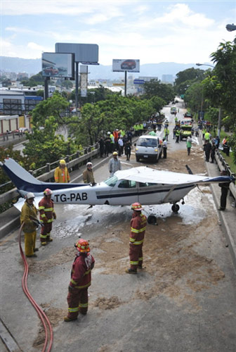 10月26日,一架塞斯纳小型飞机停在危地马拉城一公路上。这架飞机从拉奥罗拉机场起飞几分钟后冲入这条公路,造成2人受轻伤。