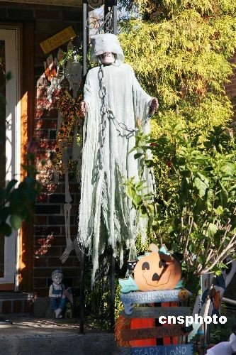 十月三十一日是一年一度的万圣节,纽约的许多居民都乐意花不多的银子,把自己家装饰得“鬼影憧憧”,以度过一个快乐节日。中新社发 魏晞 摄