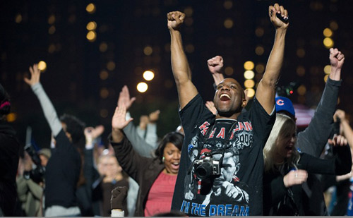 美国总统选举结果揭晓,奥巴马已经赢得足够的选举人票(270票),取得本届美国总统大选的胜利。他将成为美国首位黑人总统。图为支持者庆祝奥巴马的获胜