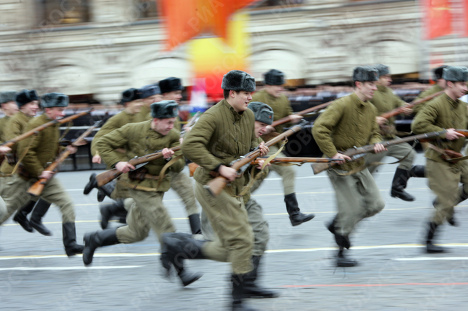 11月7日,俄罗斯士兵身着二战时期样式的军装在莫斯科红场参加阅兵仪式,纪念1941年11月7日的红场阅兵式举行67周年。1941年11月7日,在德国法西斯军队兵临莫斯科城下之际,苏联军队在红场上举行了阅兵式,纪念十月革命24周年。参加阅兵式的部队在阅兵完毕后直接开赴前线同入侵的法西斯德军作战。