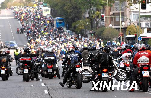 11月8日,众多摩托车手在西班牙首都马德里市中心街道参加大游行。当日,来自西班牙各地的上万名摩托车手在首都马德里参加大游行,呼吁政府部门改善道路交通条件,保障摩托车出行安全。据统计,西班牙2007年共有500余名摩托车手在交通事故中丧生。新华社记者陈海通摄