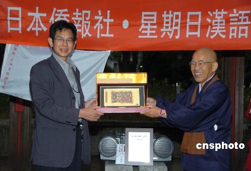 11月9日,日本侨报社创办的星期日汉语角在东京西池袋公园举行第65次交流会。会上举行了第2届小岛康誉国际贡献奖颁奖仪式。著名日中友好人士小岛康誉向为促进日中民间交流作出贡献的《日本侨报》总编辑、汉语角创办人段跃中颁发了一幅以中国新疆尼雅遗址出土的东汉“五星出东方利中国”古锦为原型的金箔艺术品和100万日元。中国驻日使馆友好交流参赞孙美娇和中日两国媒体、经济界、友好团体及旅日留学生代表等约80人出席了当天的颁奖仪式。中新社发 日本侨报社 摄