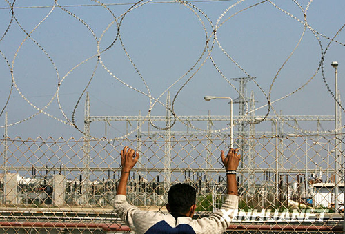 一名工人站在加沙电厂的铁丝网旁。由于以色列关闭所有口岸导致燃料短缺,加沙电厂当晚完全停工。