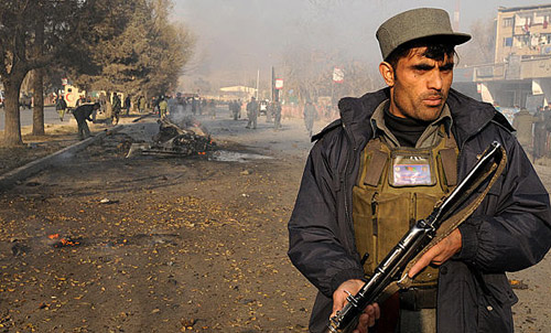 一名警察在美国驻阿富汗使馆附近的自杀式汽车炸弹袭击现场警戒。