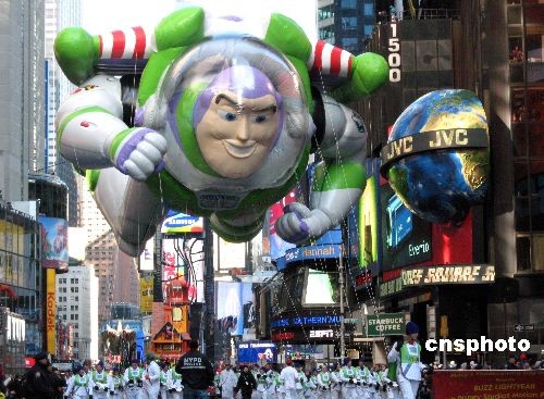 图为首次登场感恩节游行的动画片《玩具总动员》中的卡通人物热气球走过时代广场。