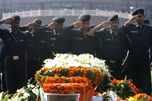 29日,数名印度国家安全卫队的突击队员向在孟买恐怖袭击案中牺牲的队友敬礼。在持续两天多的印度孟买连环恐怖袭击案中,至少造成195人死亡,其中包括22名非印度籍人士,另有近300人受伤。