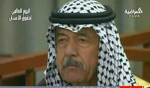 这张12月2日的电视截图显示的是伊拉克前政权高官、绰号“化学阿里”的阿里·哈桑·马吉德在首都巴格达的特别法庭接受庭审。