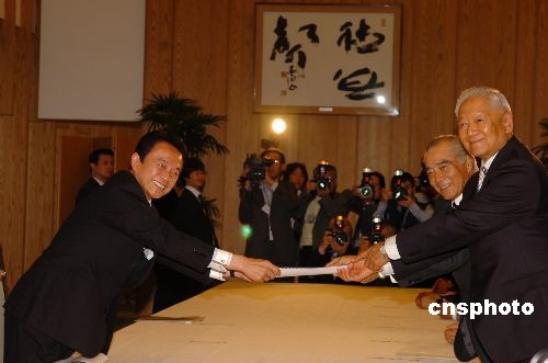 12月8日下午,日本首相麻生太郎在位于东京的首相官邸会见了新一届中日友好21世纪委员会的中日两国委员并接受了该委员会提交的最终工作报告。图为中方首席委员郑必坚和日方首席委员小林阳太郎共同向麻生首相提交工作报告。中新社发 朱沿华 摄