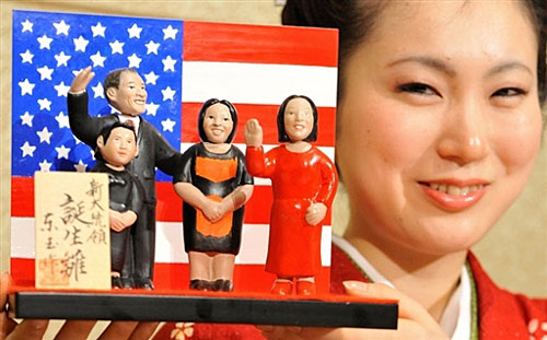 2008年12月11日,在日本东京全日空洲际酒店,日本传统玩偶制造商Togyoku推出2008年度新闻娃娃(kawaribina),藉此以反应这一年来全球所发生的新闻事件。这批玩偶包括奥巴马全家庆祝当选美国总统的玩偶和获得2008年诺贝尔奖的日本科学家玩偶。