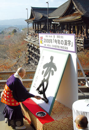 据日本共同社报道,日本汉字能力检定协会12日在京都清水寺宣布,“变”字被选为最能象征2008年世态的汉字。征集活动中共收到111208件投稿,其中6031件选择了“变”,所占比例为5.4%。选择“变”的理由包括日本首相短期内换人、提倡“变革”的奥巴马当选美国下任总统、全球金融形势动荡不安等。“金”和“落”分列二三位。