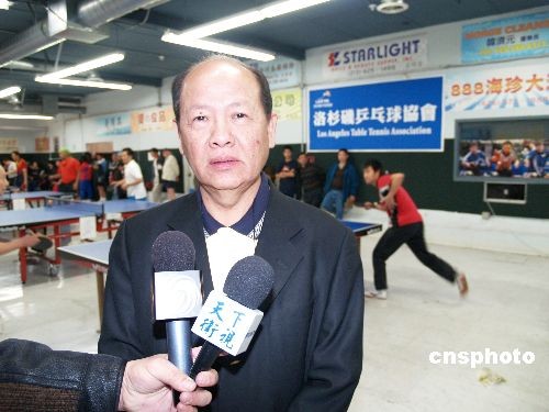 12月28日,美国亚美体育协会和洛杉矶乒乓球协会主办2008年 “团结杯”乒乓球比赛开赛,共有16支华人乒乓球队、50余名选手参加逐角。美国亚美体育协会会长吕诗澄向美国媒体介绍在海外推展乒乓球运动的体验。中新社发 卢威 摄